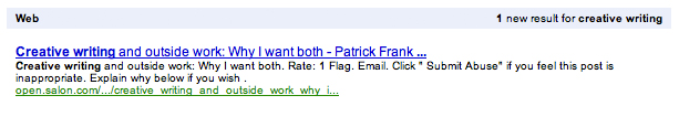 I set up four Google Alerts for topics that interest me: interactive fiction, creative writing, screenwriting and online community.
